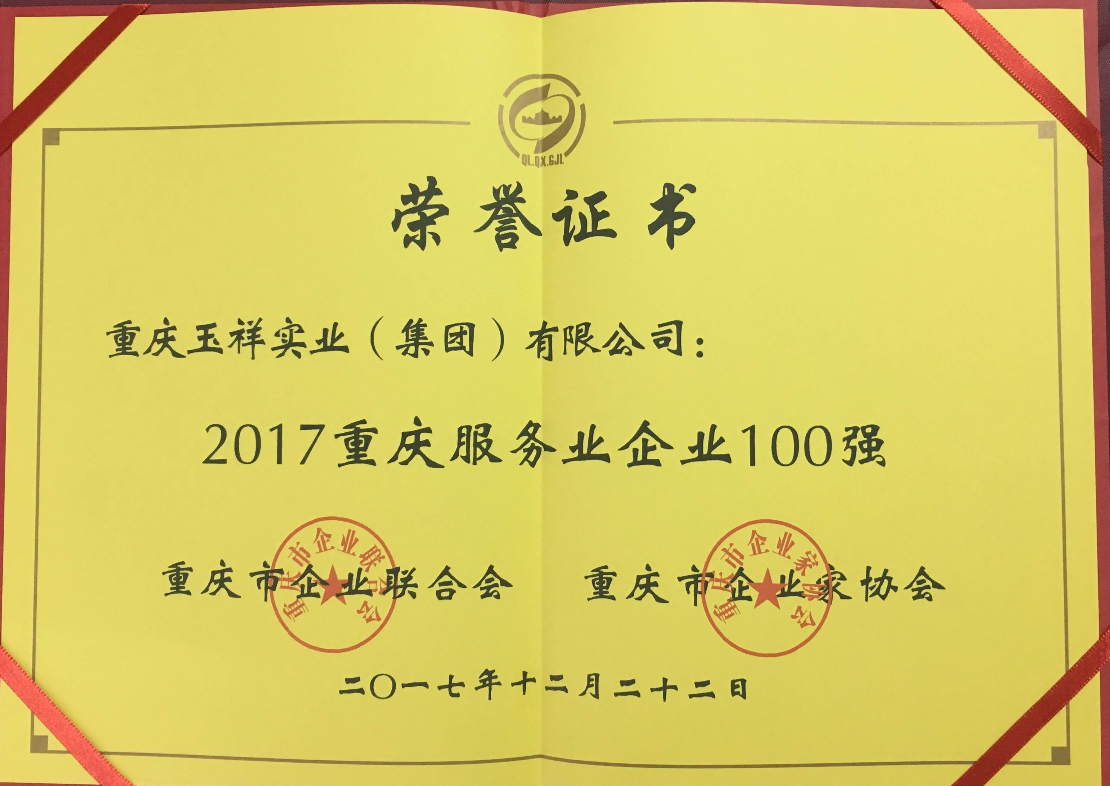英国上市公司365实业集团荣获“2017重庆服务业企业100强”称号